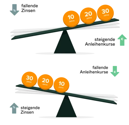 Zinsänderungsrisiko: Ändert sich das allgemeine Zinsniveau, beeinflusst das den Kurs bestehender Anleihen – insbesondere steigende Zinsen führen oft zu Kursverlusten.