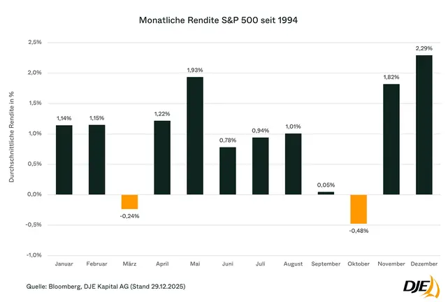 Die Grafik zeigt die monatlichen Durchschnittsrenditen des US-Leitindex S&P 500 seit 1994 und ordnet den Januar im historischen Kontext ein.