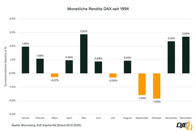 Die Grafik veranschaulicht dieses Muster anhand der monatlichen Renditen des DAX seit 1994.