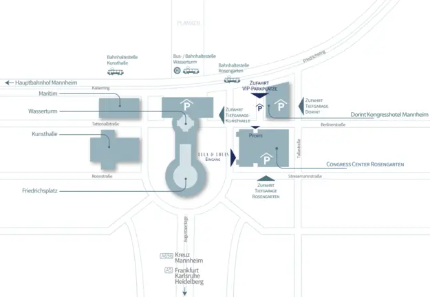 Für das Fondsgipfel Spezial begrüßen wir Sie im Ella & Louis Jazzclub im Mannheimer Rosengarten. Der Club liegt zentral gegenüber des Wasserturms und ist bequem zu Fuß, mit öffentlichen Verkehrsmitteln oder dem Auto erreichbar. Parkmöglichkeiten stehen in den Tiefgaragen des Congress Center Rosengarten zur Verfügung.