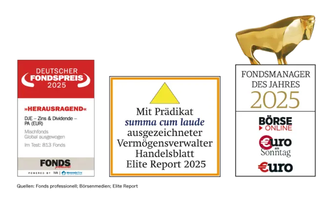Dies ist eine Marketing-Anzeige. Bitte lesen Sie den Verkaufsprospekt des betreffenden Fonds und das PRIIPs-KID, bevor Sie eine endgültige Anlageentscheidung treffen. Darin sind auch die ausführlichen Informationen zu Chancen und Risiken enthalten. Diese Unterlagen können in deutscher Sprache kostenlos auf www.dje.de unter dem betreffenden Fonds abgerufen werden. Eine Zusammenfassung der Anlegerrechte kann in deutscher Sprache kostenlos in elektronischer Form auf der Webseite unter www.dje.de/de/zusammenfassung-der-anlegerrechte abgerufen werden. Alle hier veröffentlichten Angaben dienen ausschließlich Ihrer Information, können sich jederzeit ändern und stellen keine Anlageberatung oder sonstige Empfehlung dar. Die in diesem Dokument enthaltenen Aussagen geben die aktuelle Einschätzung der DJE Kapital AG wieder. Die zum Ausdruck gebrachten Meinungen können sich jederzeit, ohne vorherige Ankündigung, ändern. Alle Angaben dieser Übersicht sind mit Sorgfalt entsprechend dem Kenntnisstand zum Zeitpunkt der Erstellung gemacht worden. Für die Richtigkeit und Vollständigkeit kann jedoch keine Gewähr und keine Haftung übernommen werden.