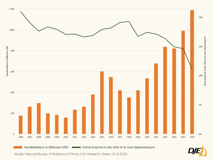Immer häufiger geraten diese hohen Exportüberschüsse jedoch international unter Druck. Über Regionen hinweg wächst die Sorge vor Marktverzerrungen durch preisgünstige chinesische Waren, Überkapazitäten in Schlüsselindustrien und Abhängigkeiten in sensiblen Lieferketten. Politische Gegenmaßnahmen wie Zölle, Industrieförderprogramme oder „De-Risking“-Strategien könnten die bisher stabilen Exportströme perspektivisch erschweren.