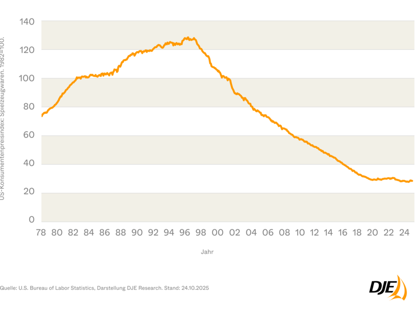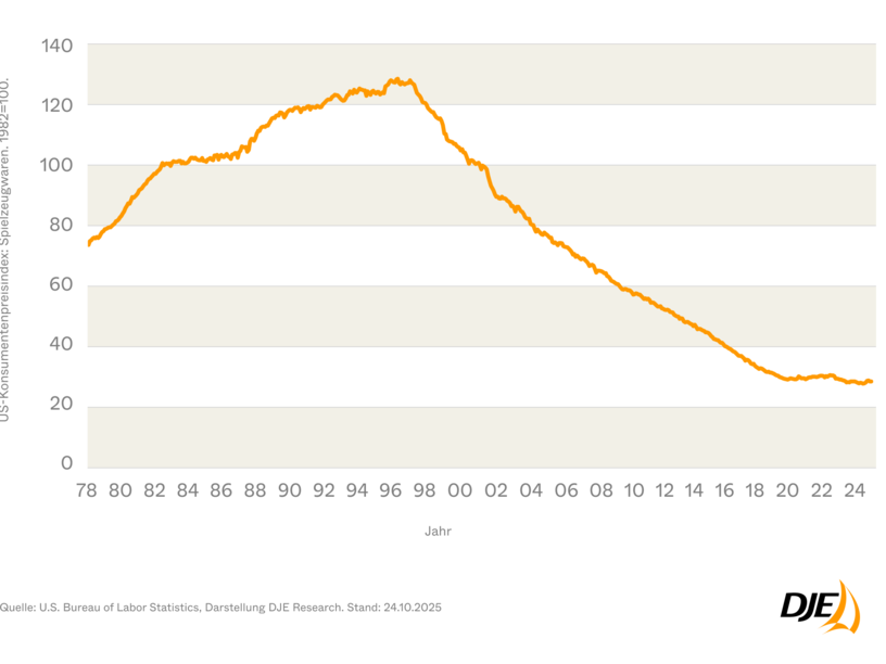 Die Spielzeugpreise in den USA sind seit Mitte der 1990er Jahre stark gefallen. Der entsprechende Verbraucherpreisindex sank zwischen 1995 und 2020 von rund 125 auf etwa 27 Punkte. Das entspricht einem Preisrückgang von rund 80 Prozent. Über mehr als zwei Jahrzehnte hinweg entsprach dies einer durchschnittlichen Deflation von etwa 5 bis 7 Prozent pro Jahr. Innerhalb des Konsumgüterkorbs stellt diese Entwicklung einen absoluten Extremfall dar.
