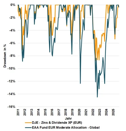 Mit diesem Investmentansatz ist es dem Fonds gelungen, seit seiner Auflage im Dezember 2010 unterschiedlichste Marktphasen und tiefgreifende Krisen erfolgreich zu durchlaufen – darunter strukturell herausfordernde Perioden wie die Euro-Schuldenkrise (2011–2012), der Abschwung in China (2015–2016) sowie die Phase hoher, teils zweistelliger Inflation (2022). Hinzu kommen Ereignisse der jüngeren Historie wie die Corona-Pandemie (2020–2022), der Ukraine-Konflikt (2022) und der sogenannte „Liberation Day“, an dem die US weltweit Zölle verhängten (April 2025). Dank konsequenter Risikosteuerung konnte der Fonds in solchen Phasen meist geringere Verluste verzeichnen als die Vergleichsgruppe.